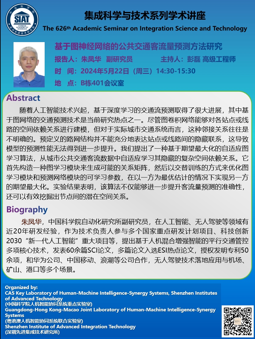 集成所第626期集成科学与技术系列学术讲座将于2024年5月22日(周三)14:30-15:30在B栋401会议室召开,本次讲座特邀中国科学院自动化研究所的朱凤华 副研究员作题为《基于图神经网络的公共交通客流量预测方法研究》的学术报告。
