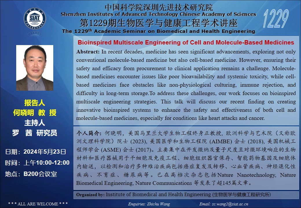 本次讲座邀请了 何晓明 教授带来题为“Bioinspired Multiscale Engineering of Cell and Molecule-Based Medicines”的报告。