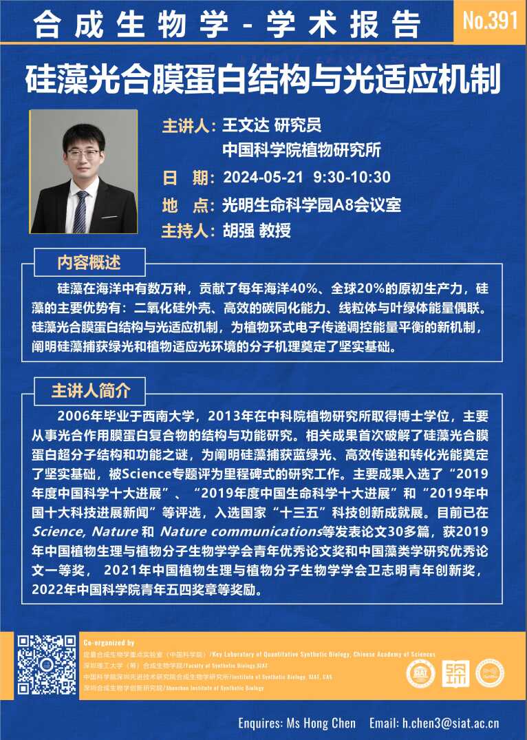 合成所/合成生物学院第391期学术讲座将于 5月21日(星期二)9:30-10:30 在 光明生命科学园A8会议室 举行。