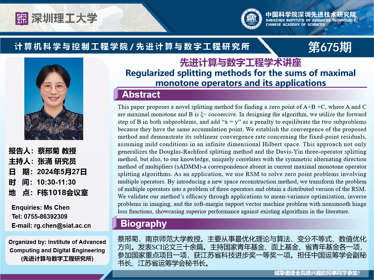 大家好!先进计算与数字工程研究所/计算机学院第675期学术讲座将于5月27日10:30-11:30在F1018会议室举行,本次讲座将邀请南京师范大学 蔡邢菊 教授作题为“Regularized splitting methods for the sums of maximal monotone operators and its applications”的报告。本次报告将由数字所 张涌 研究员主持,诚挚邀请大家参加、学习和交流!