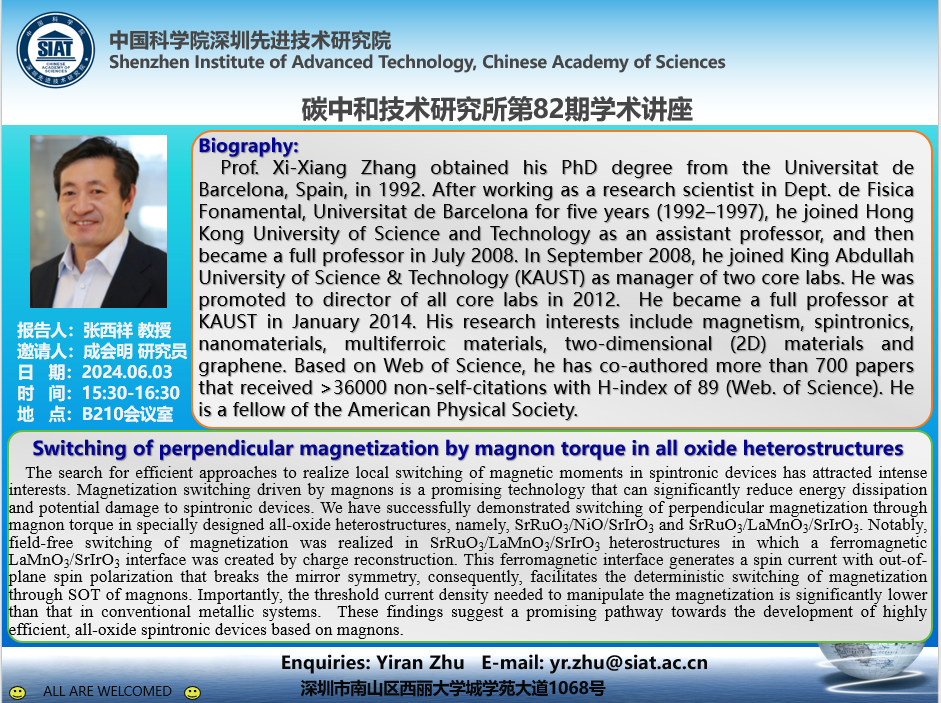 碳中和技术研究所第82期学术讲座将于6月3日(周一)15:30-16:30在B210会议室召开。本次讲座特邀阿卜杜拉国王科技大学的张西祥教授作题为《Switching of perpendicular magnetization by magnon torque in all oxide heterostructures》的学术报告。