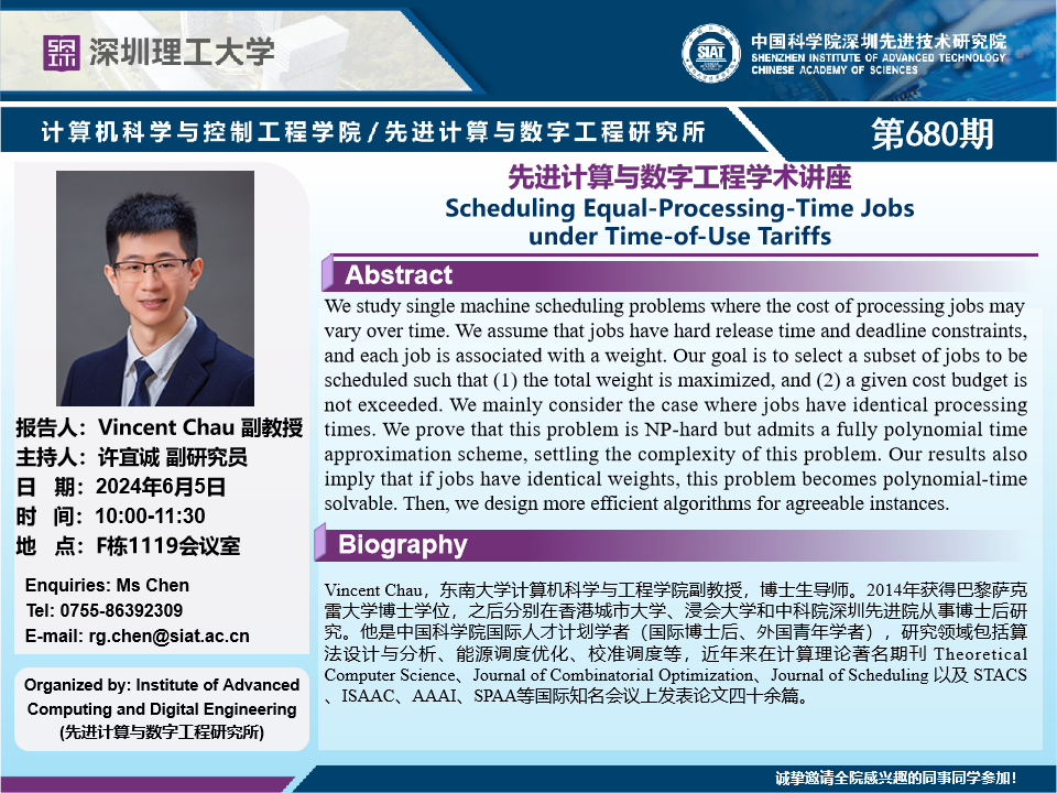 大家好!数字所/计算机学院第680期学术讲座将于6月5日10:00-11:30在F1119会议室举行,本次讲座将邀请东南大学 Vincent Chau 副教授作题为“Scheduling Equal-Processing-Time Jobs under Time-of-Use Tariffs”的报告。本次报告将由数字所 许宜诚 副研究员主持,诚挚邀请大家参加、学习和交流!