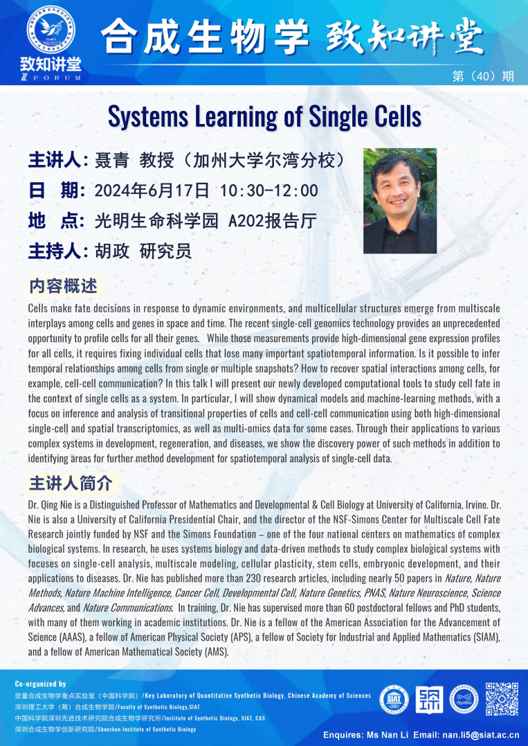 【2024年6月17日 深圳合成生物学创新研究院/合成生物学研究所/合成生物学院】Systems Learning of Single Cells