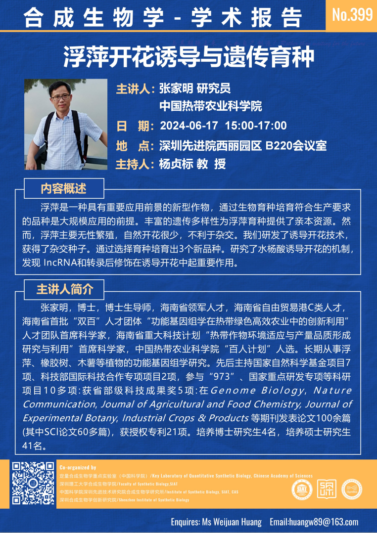 本次讲座邀请了 张家明 研究员 带来题为“浮萍开花诱导与遗传育种”的报告。