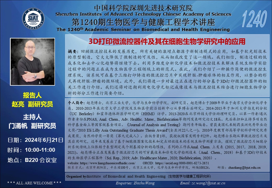 本次讲座邀请了北京工业大学 赵亮 副研究员带来题为“3D打印微流控器件及其在细胞生物学研究中的应用”的报告。