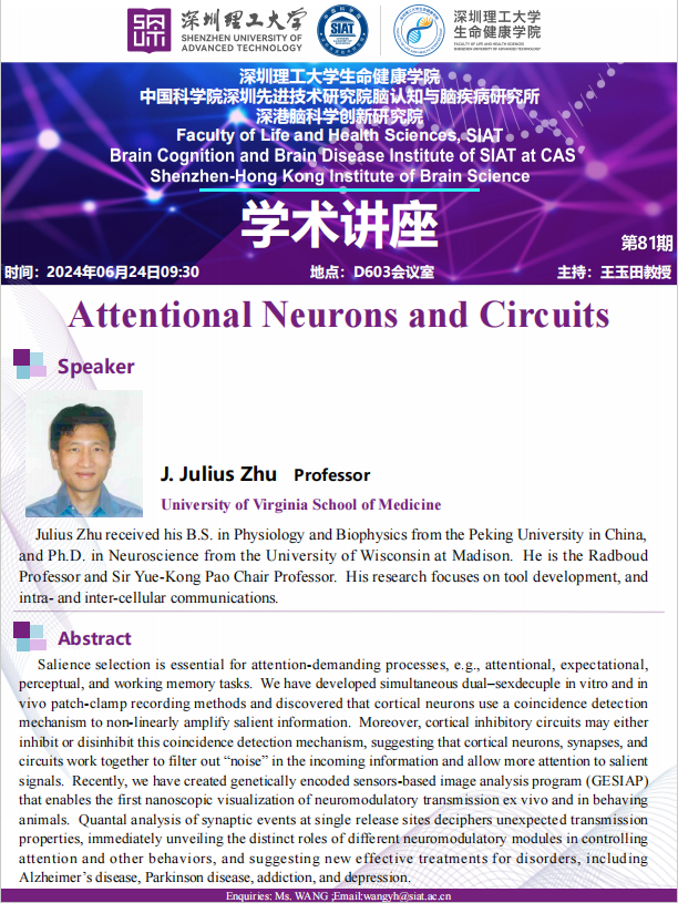 大家好! 生命健康学院将于06月24日 09:30,地点:D603会议室 举办第81期学术讲座。 由弗吉尼亚大学医学院,J. Julius Zhu教授,带来题为“Attentional Neurons and Circuits”专题讲座。 诚挚邀请大家学习交流!