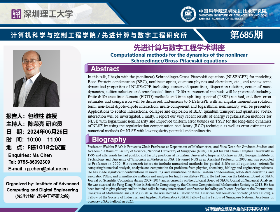 大家好!数字所/计算机学院第685期学术讲座将于6月26日10:00-11:00在F1018会议室举行,本次讲座将邀请新加坡国立大学 包维柱 教授作题为“Computational methods for the dynamics of the nonlinear Schroedinger/Gross-Pitaevskii equations”的报告。本次报告将由数字所 陈荣亮 研究员主持,诚挚邀请大家参加、学习和交流!