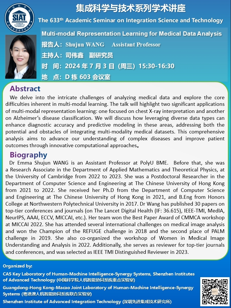 集成所第630期集成科学与技术系列学术讲座将于7月3日(周三)15:30 - 16:30在D栋603会议室召开,本次讲座特邀香港理工大学的Dr. Shujun WANG作题为《Multi-modal Representation Learning for Medical Data Analysis》的学术报告。