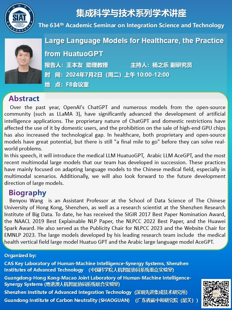 集成所第634期集成科学与技术系列学术讲座将于7月2日(周二)上午 10:00-12:00在F8会议室召开,本次讲座特邀香港中文大学(深圳)的Dr.Benyou Wang作题为《Large Language Models for Healthcare, the Practice from HuatuoGPT》的学术报告。