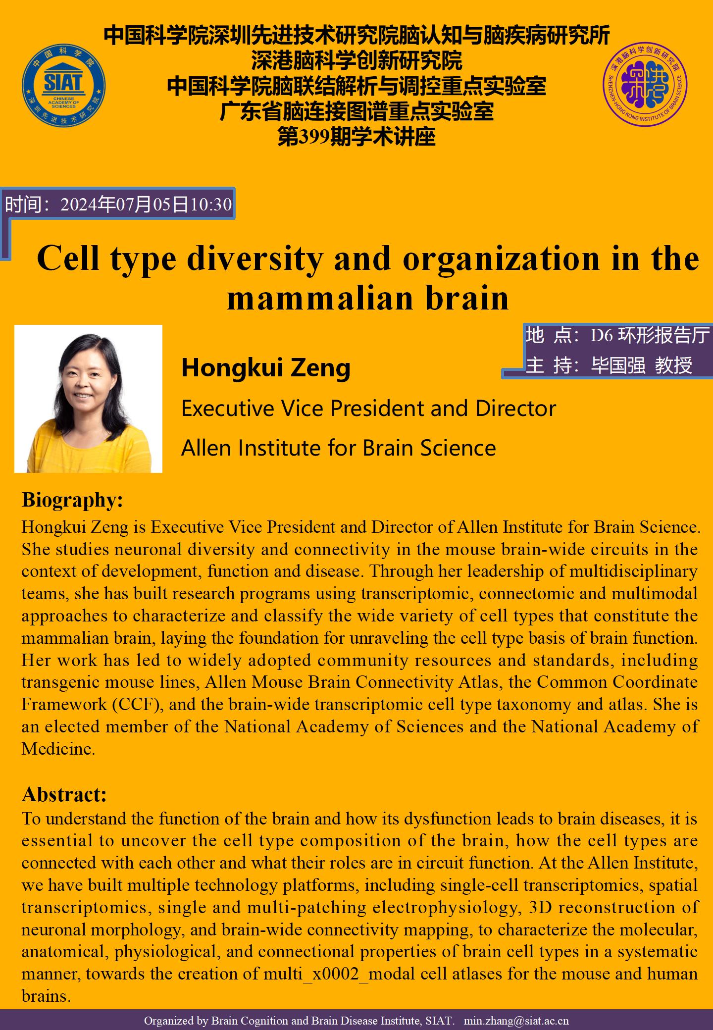脑所/深港脑院将于7月5日10:30,地点:D6环形报告厅 举办第399期学术讲座。本次讲座邀请到Allen Institute for Brain Science,Hongkui Zeng教授,带来题为“Cell type diversity and organization in the mammalian brain”的报告。