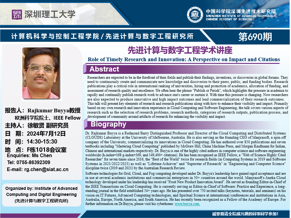 大家好!数字所/计算机学院第690期学术讲座将于7月12日14:30-15:30在F1018会议室举行,本次讲座将邀请澳大利亚墨尔本大学 Rajkumar Buyya 教授(欧洲科学院院士、IEEE Fellow)作题为“Role of Timely Research and Innovation: A Perspective on Impact and Citations”的报告。本次报告将由数字所 徐敏贤 副研究员主持,诚挚邀请大家参加、学习和交流!