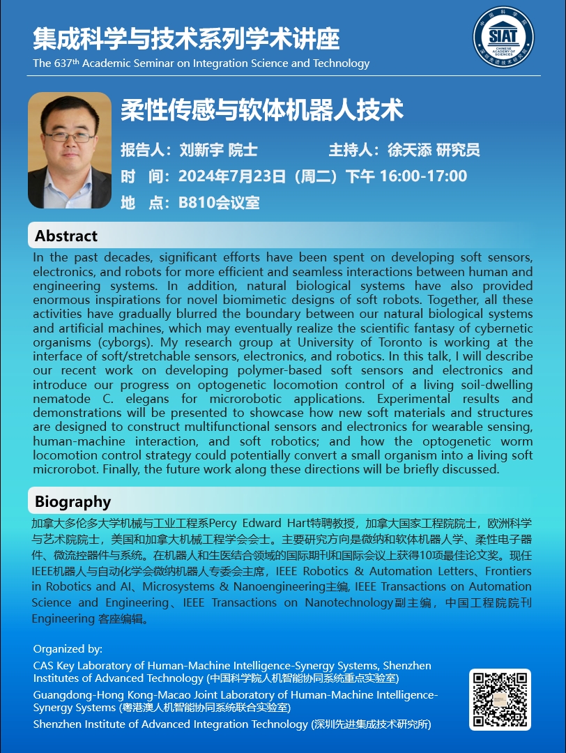 集成所第637期集成科学与技术系列学术讲座将于2024年7月23日(周二)下午16:00-17:00在B810会议室召开,本次讲座特邀加拿大多伦多大学的刘新宇 院士作题为《柔性传感与软体机器人技术》的学术报告。