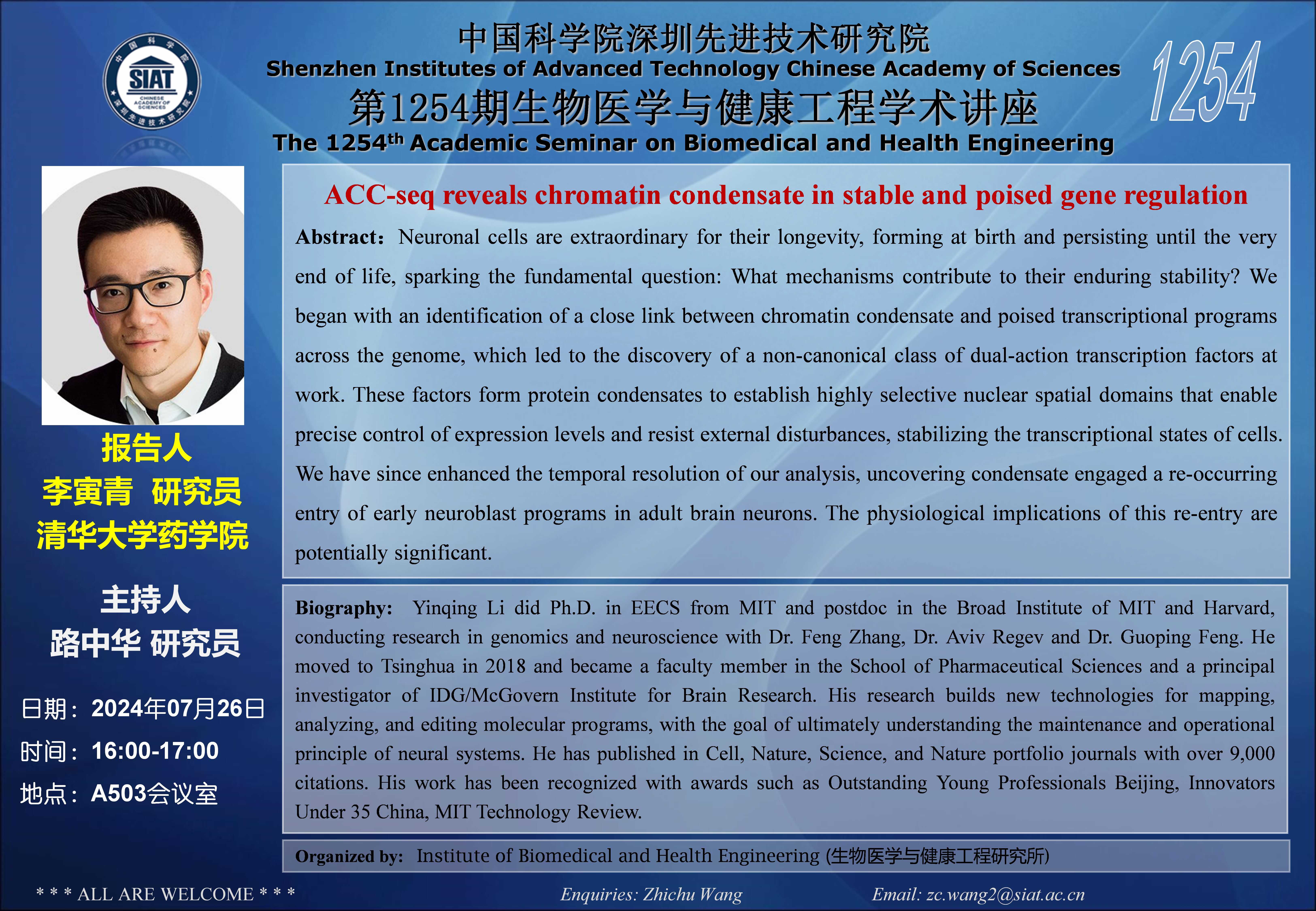 本次讲座邀请了清华大学 李寅青 研究员带来题为“ACC-seq reveals chromatin condensate in stable and poised gene regulation”的报告。