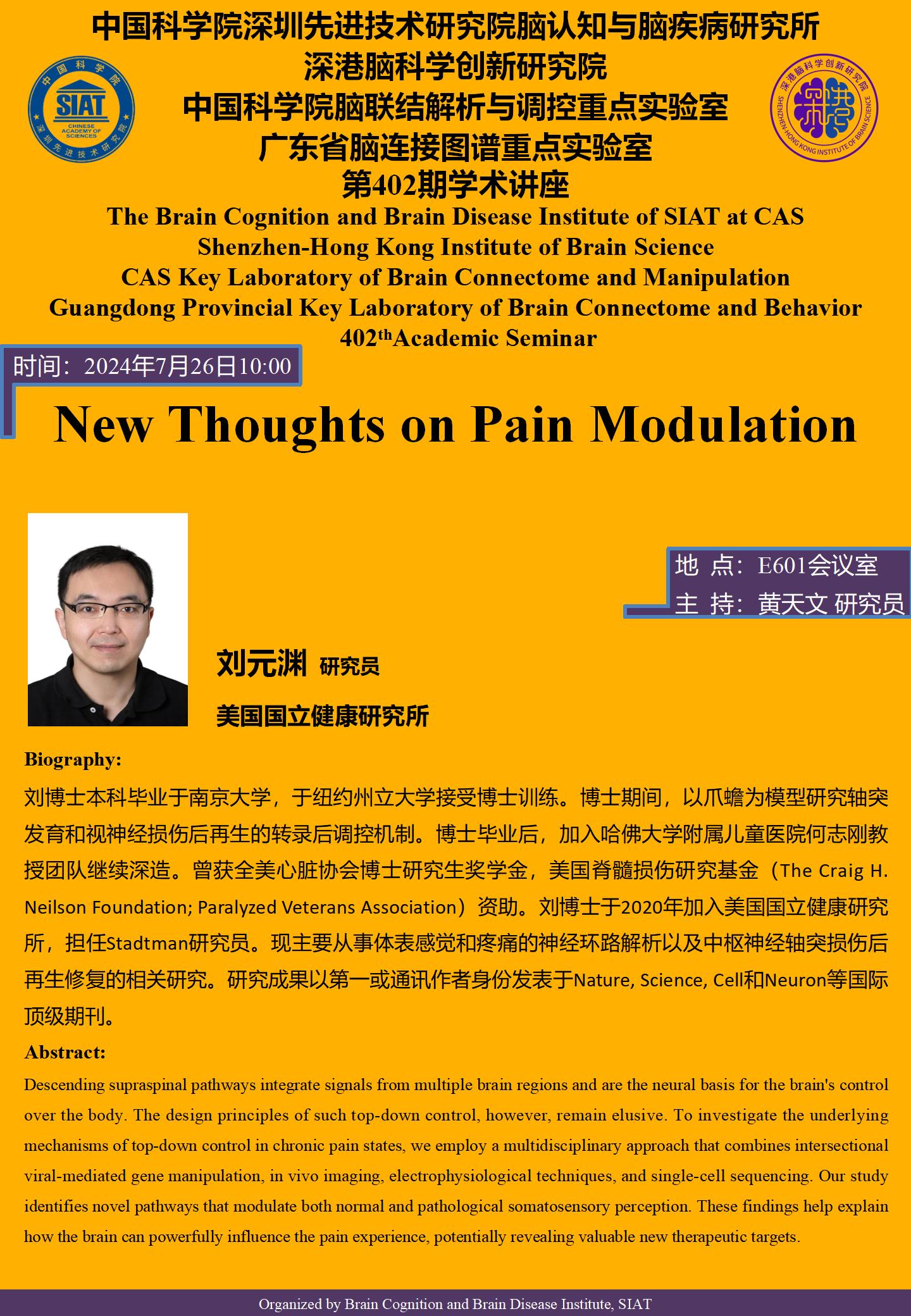 【2024年7月26日 脑所/深港脑院】New Thoughts on Pain Modulation