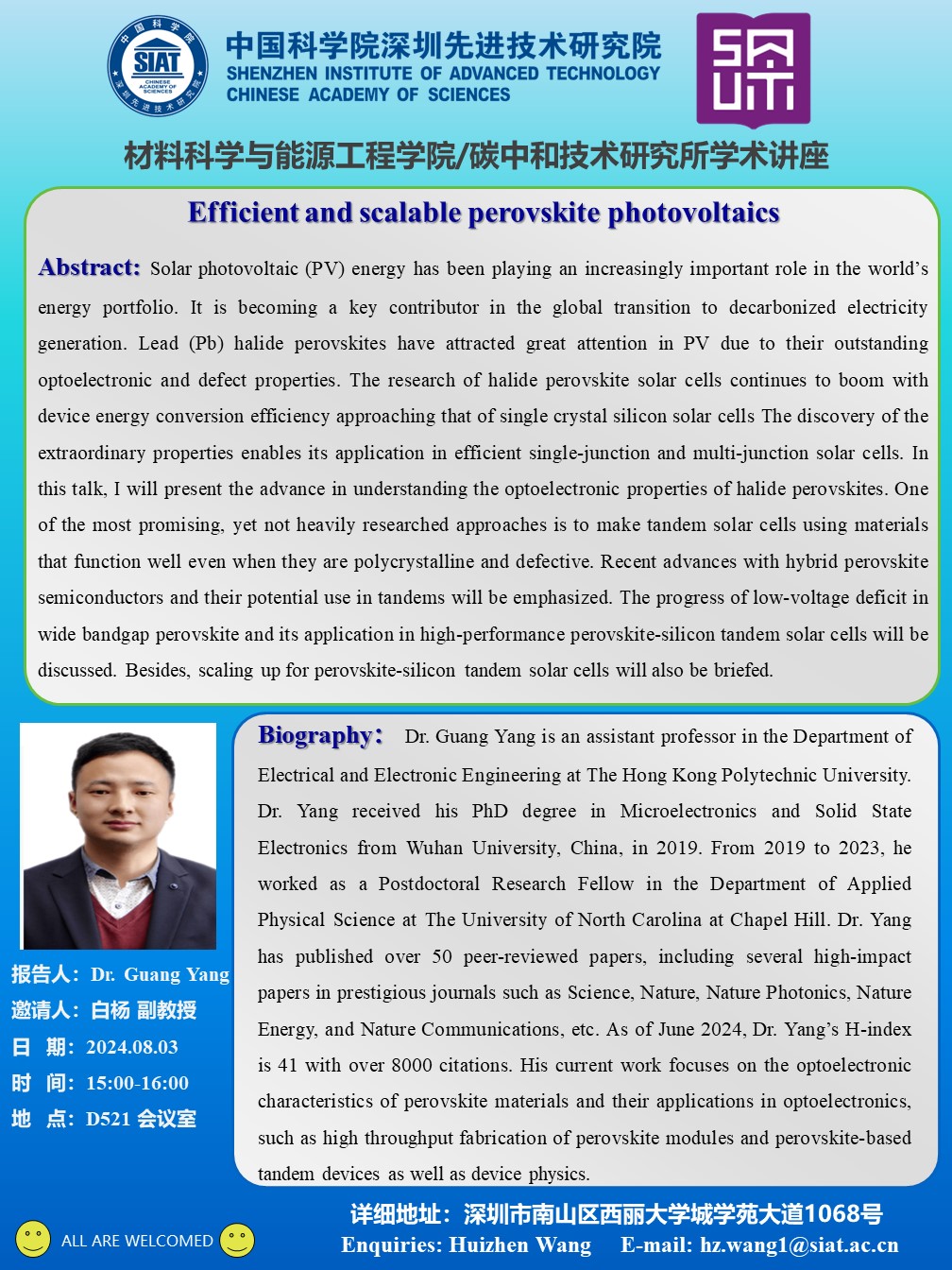 材料科学与能源工程学院/碳中和技术研究所学术讲座将于8月3日(周六)15:00-16:00在D521会议室召开。本次讲座特邀香港理工大学助理教授 Dr. Guang Yang 作题为《Efficient and scalable perovskite photovoltaics》的学术报告。
