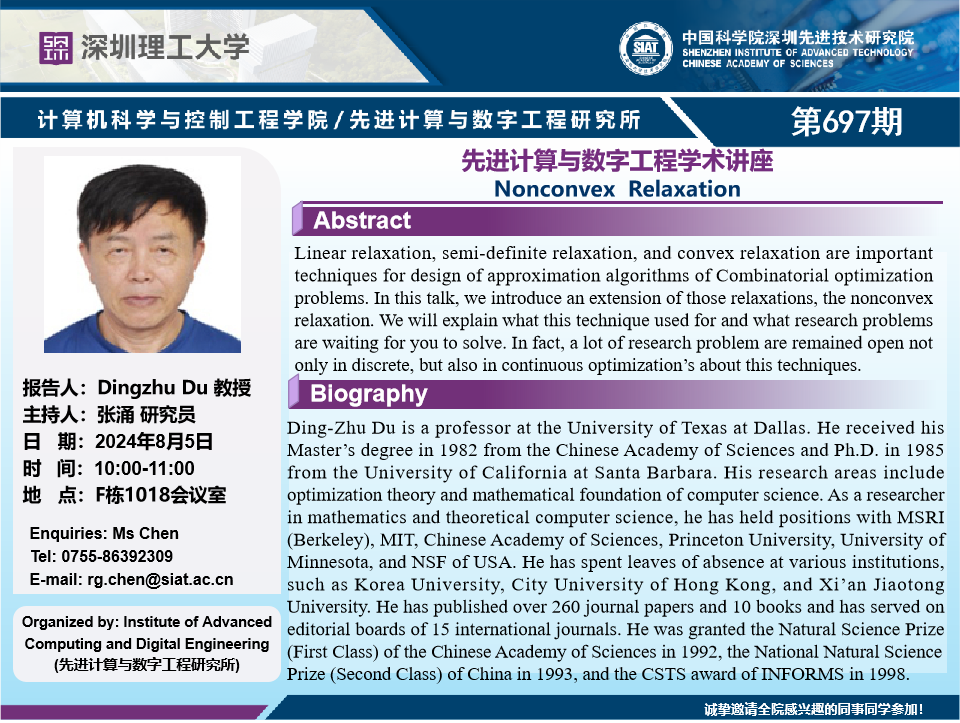 大家好!数字所/计算机学院第697期学术讲座将于8月5日10:00-11:00在F1018会议室举行,本次讲座将邀请德克萨斯大学达拉斯分校 Dingzhu Du 教授作题为“Nonconvex Relaxation”的报告。本次报告将由数字所 张涌 研究员主持,诚挚邀请大家参加、学习和交流!