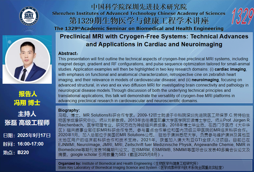 本次讲座邀请了冯翔 博士带来题为“Preclinical MRI with Cryogen-Free Systems: Technical Advances and Applications in Cardiac and Neuroimaging”的报告。
