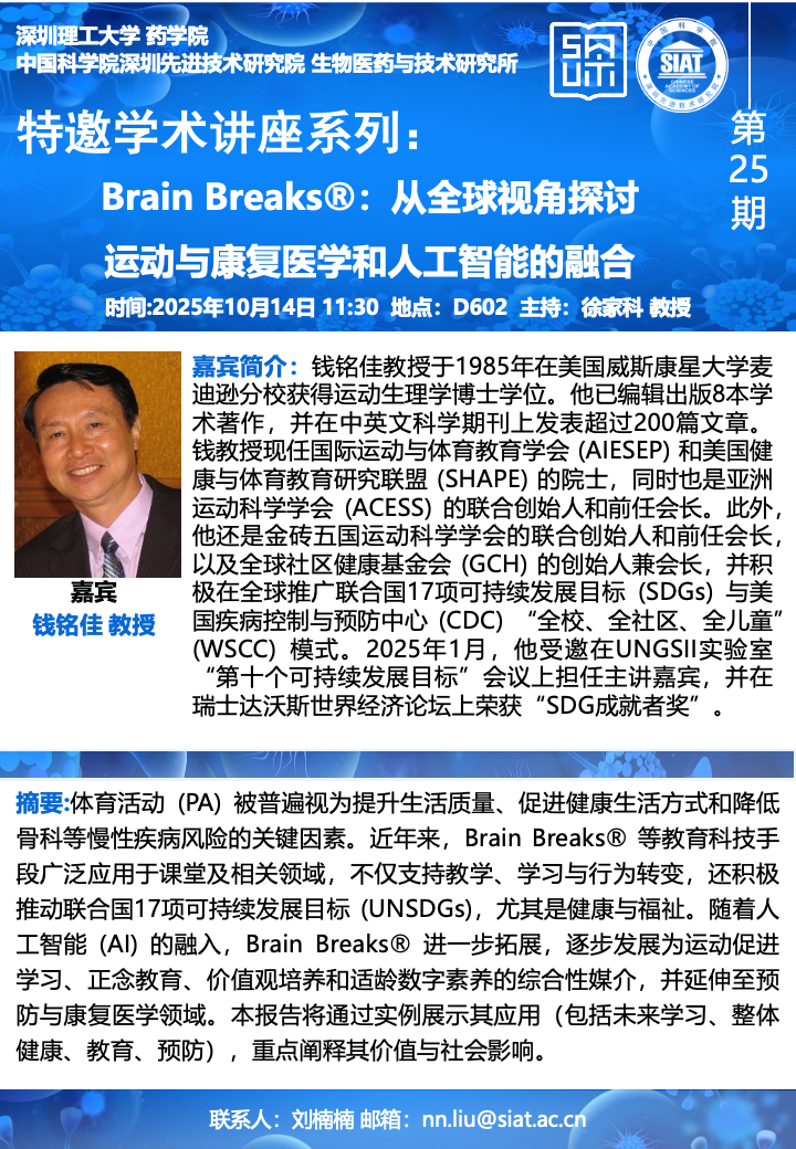大家好!药学院/医药所“特邀学术讲座系列”第25期将于2025年10月14日(周二)上午11:30,在先进院D602会议室举行。本期讲座特邀国际运动与体育教育学会及美国健康与体育联盟的钱铭佳 教授,带来题为“Brain Breaks®:从全球视角探讨运动与康复医学和人工智能的融合”的报告。届时,徐家科 教授将主持讲座。