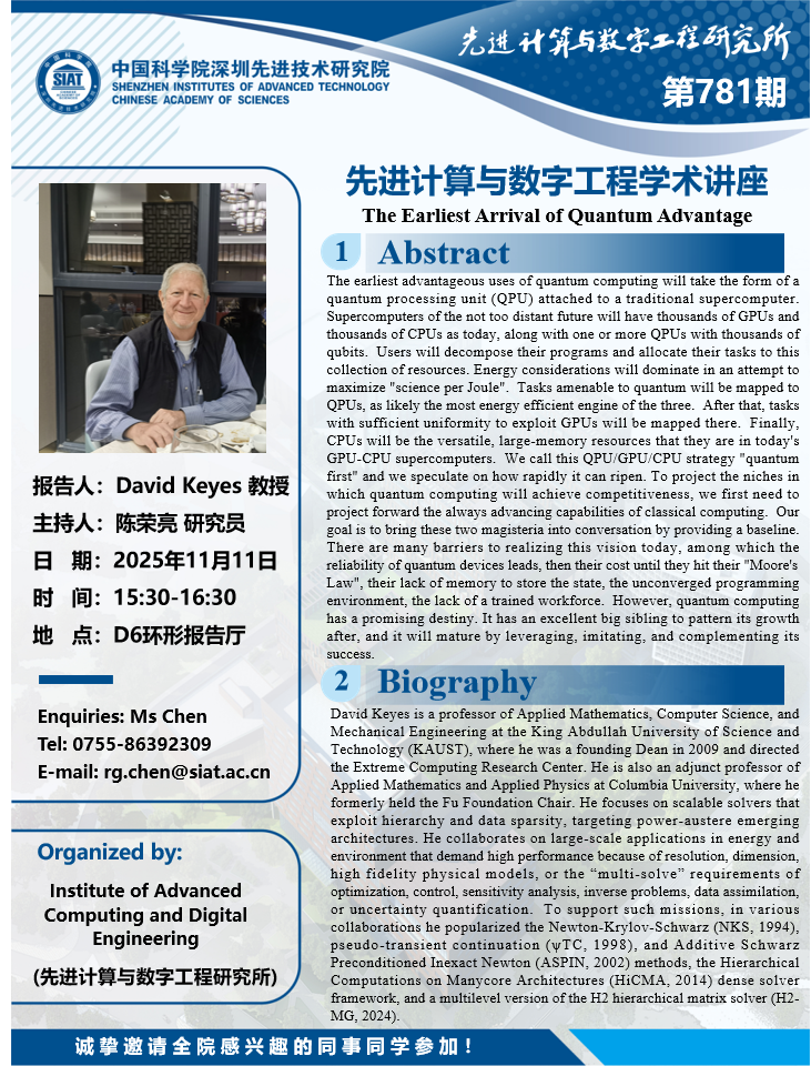 大家好!数字所/计算机学院第781期学术讲座将于11月11日15:30-16:30在D6环形报告厅举行,本次讲座将邀请阿卜杜拉国王科技大学(King Abdullah University of Science & Technology) David Keyes 教授作题为“The Earliest Arrival of Quantum Advantage”的报告。本次报告将由数字所 陈荣亮 研究员主持,诚挚邀请大家参加、学习和交流!