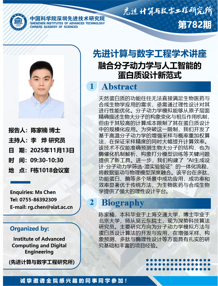 大家好!数字所/计算机学院第782期学术讲座将于11月13日9:30-10:30在F1018会议室举行,本次讲座将邀请深势科技 陈家楠 博士作题为“融合分子动力学与人工智能的蛋白质设计新范式”的报告。本次报告将由数字所 李烨 研究员主持,诚挚邀请大家参加、学习和交流!