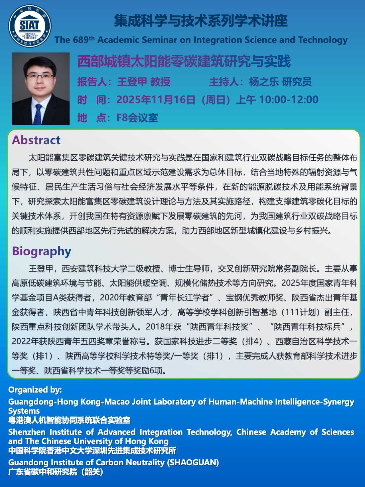 集成所第689期集成科学与技术系列学术讲座将于 2025年11月16日(周日)上午 10:00-12:00 在 F栋8楼会议室 召开。本次讲座特邀 西安建筑科技大学 的 王登甲 教授 作题为《西部城镇太阳能零碳建筑研究与实践》的学术报告。