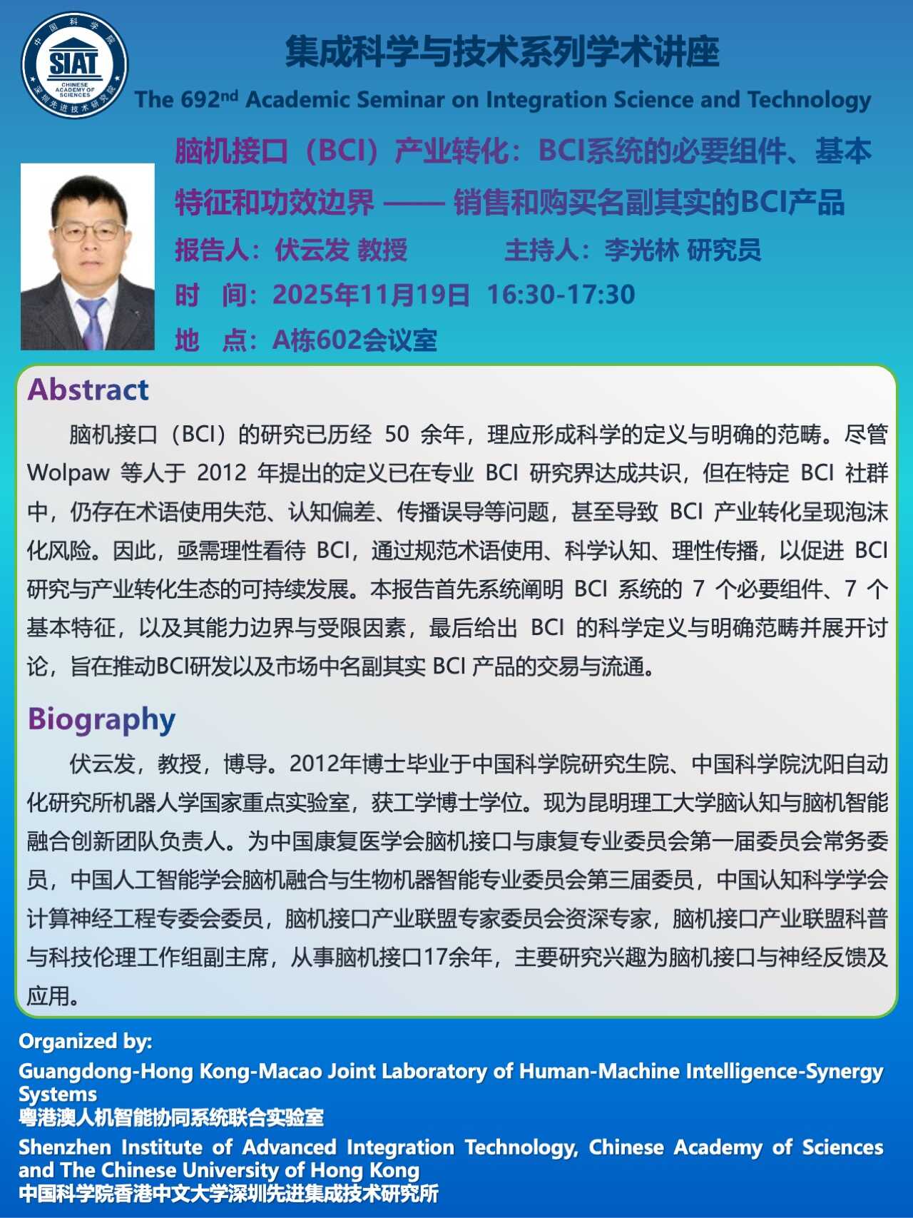 集成所第692期集成科学与技术系列学术讲座将于 2025年11月19日(周三)16:30-17:30 在 A栋602会议室 召开。本次讲座特邀 昆明理工大学 的 伏云发 教授 作题为《脑机接口(BCI)产业转化:BCI系统的必要组件、基本特征和功效边界——销售和购买名副其实的BCI产品》的学术报告。