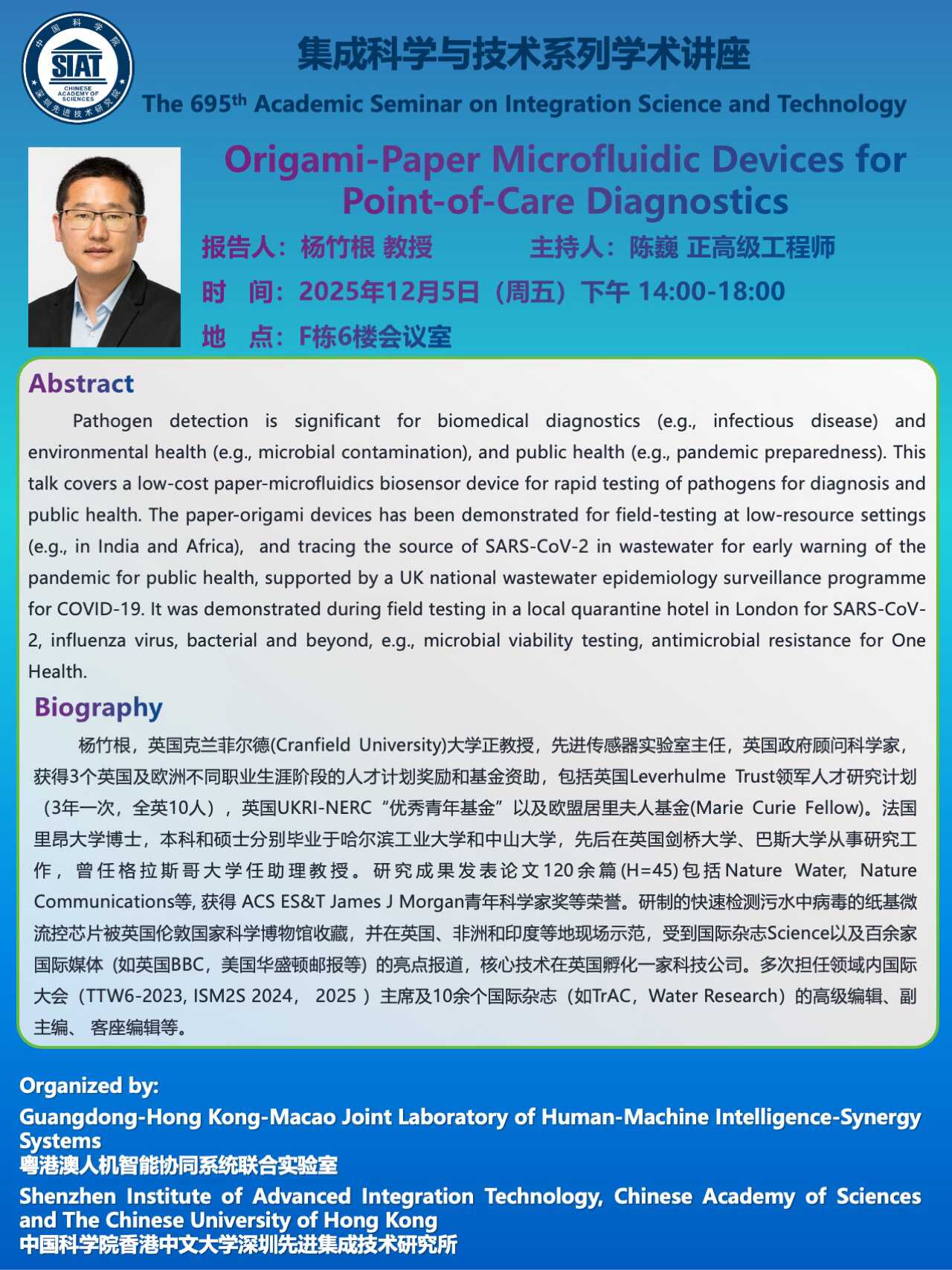 集成所第695期集成科学与技术系列学术讲座将于 2025年12月5日(周五)下午 14:00-18:00 在 F栋6楼会议室 召开。本次讲座特邀 英国克兰菲尔德大学 的 杨竹根 教授 作题为《Origami-Paper Microfluidic Devices for Point-of-Care Diagnostics》的学术报告。