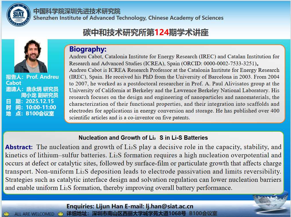 碳中和技术研究所第124期学术讲座将于12月15日(周一)10:00-11:00在B100会议室召开。本次讲座特邀西班牙加泰罗尼亚能源研究所 Prof. Andreu Cabot 作题为《 Nucleation and Growth of Li₂S in Li-S Batteries》的学术报告。