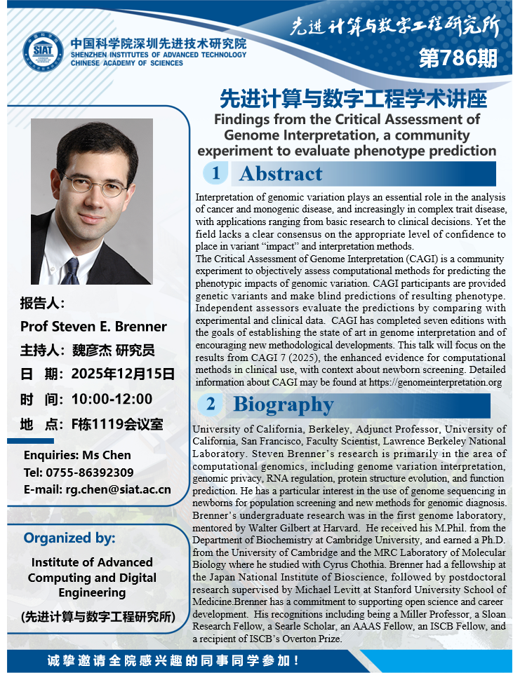 大家好!数字所/计算机学院第786期学术讲座将于12月15日10:00-12:00在F1119会议室举行,本次讲座将邀请加利福尼亚大学伯克利分校(University of California, Berkeley)Steven E. Brenner 教授作题为“Findings from the Critical Assessment of Genome Interpretation, a community experiment to evaluate phenotype prediction”的报告。本次报告将由数字所 魏彦杰 研究员主持,诚挚邀请大家参加、学习和交流!