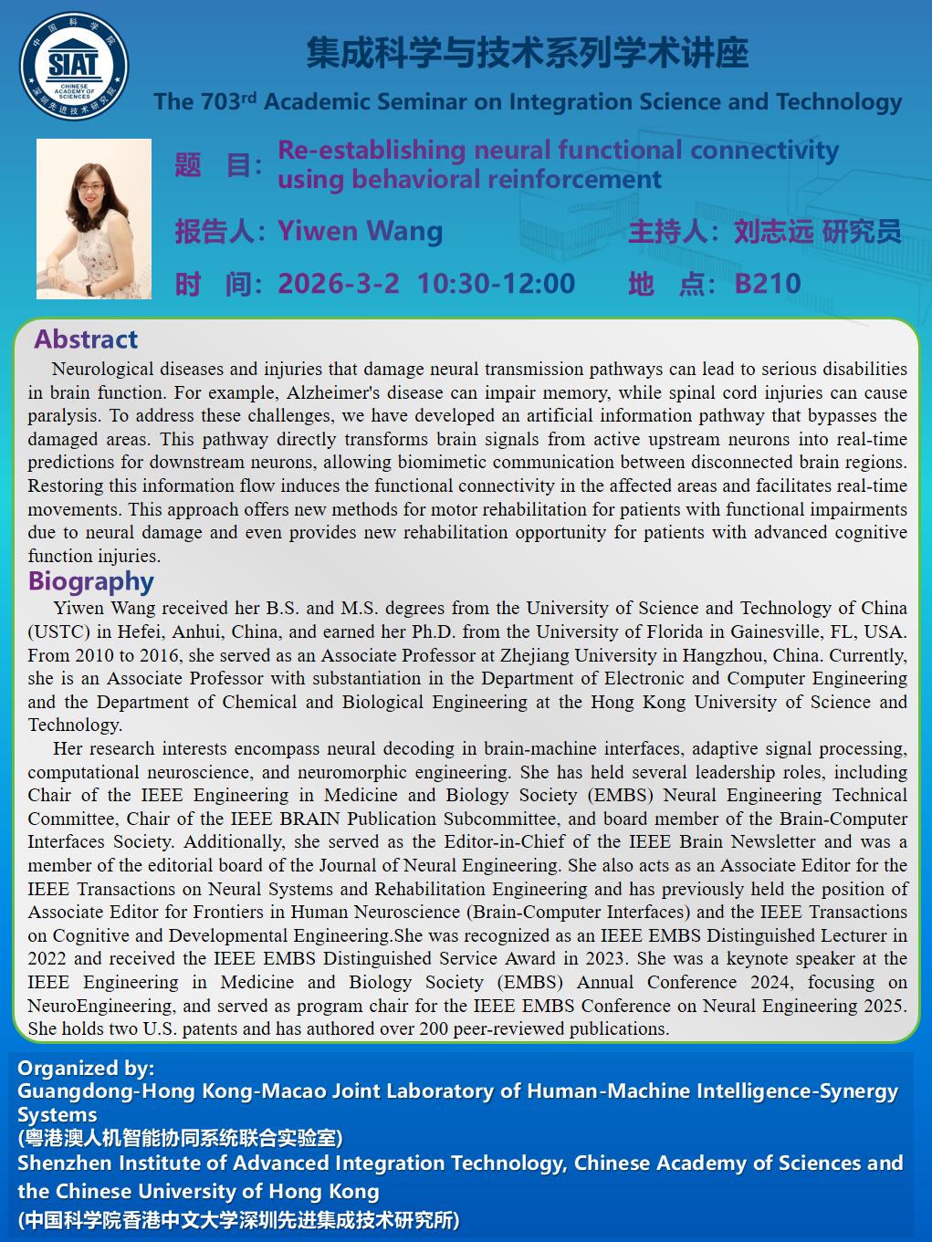 集成所 第703期 集成科学与技术系列学术讲座将于 2026年3月2日(周一) 10:30-12:00 在 B201会议室 召开。本次讲座特邀 香港科技大学 的 王怡雯 博士 作题为《Re-establishing neural functional connectivity using behavioral reinforcement》的学术报告。