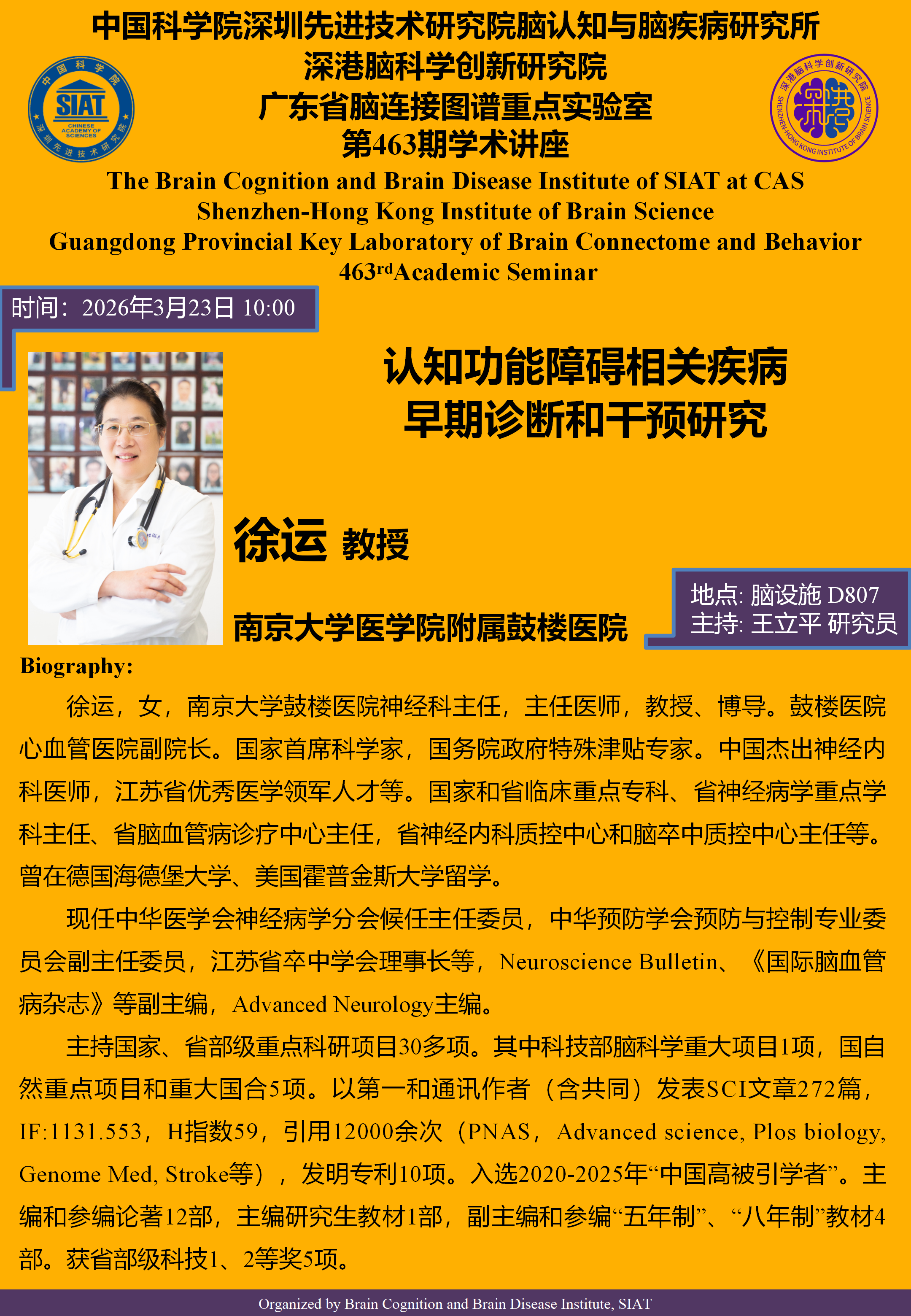 大家好!脑所/深港脑院将于3月23日(星期一) 10:00,地点:脑设施D807会议室 举办第463期学术讲座。本次讲座邀请到南京大学医学院附属鼓楼医院 徐运教授,带来题为“认知功能障碍相关疾病早期诊断和干预研究”的报告。
