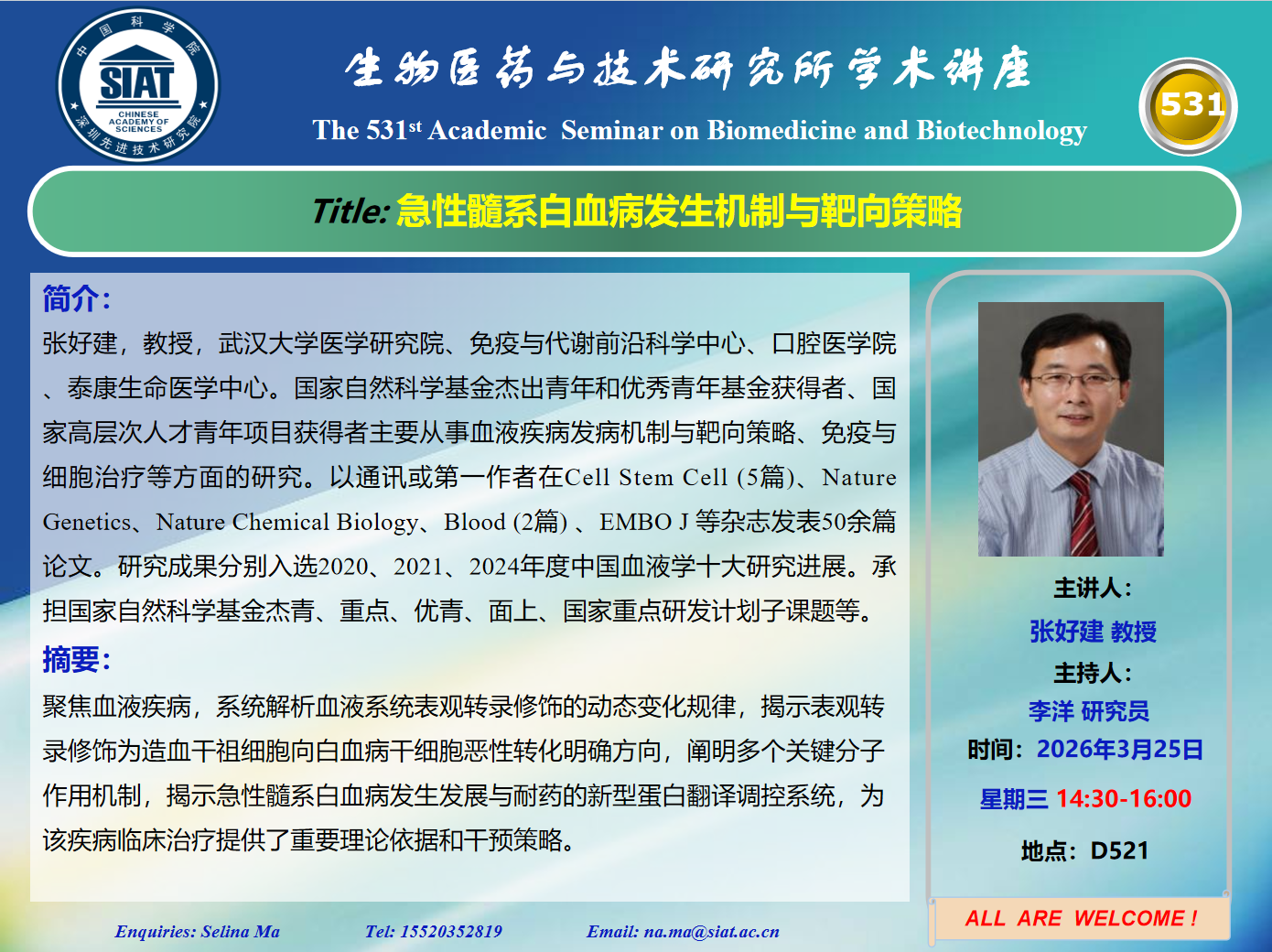 大家好! 医药所第531期学术讲座将于2026年3月25日 星期三 14:30-16:00 D521会议室举行。本次讲座邀请了来自武汉大学 张好建 教授带来“急性髓系白血病发生机制与靶向策略”的报告。
