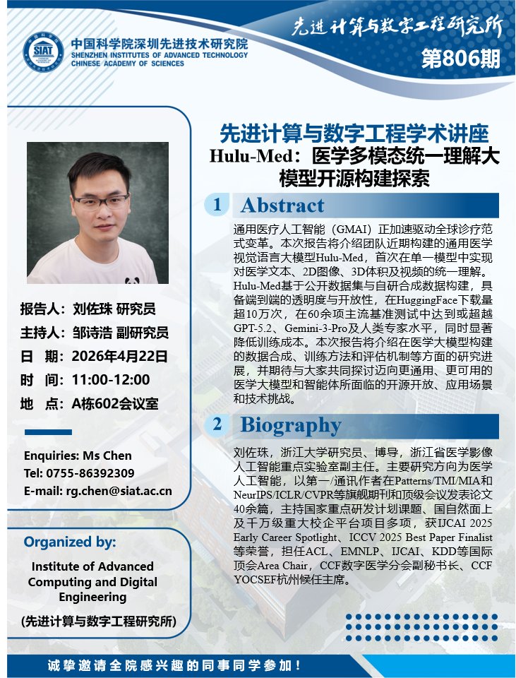 大家好!数字所/计算机学院第806期学术讲座将于4月22日11:00-12:00在A栋602会议室举行,本次讲座将邀请浙江大学 刘佐珠 研究员作题为“Hulu-Med:医学多模态统一理解大模型开源构建探索”的报告。 本次报告将由数字所 邹诗浩 副研究员主持,诚挚邀请大家参加、学习和交流!