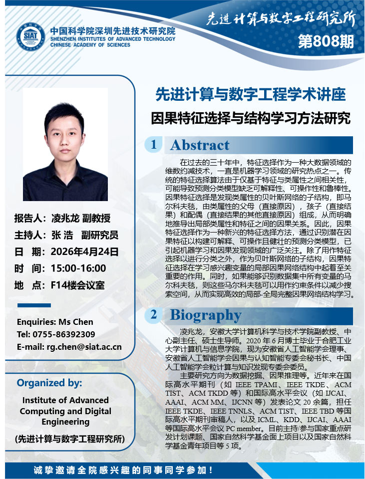 大家好!数字所/计算机学院第808期学术讲座将于4月24日15:00-16:00在F14楼会议室举行,本次讲座将邀请安徽大学 凌兆龙 副教授作题为“因果特征选择与结构学习方法研究”的报告。